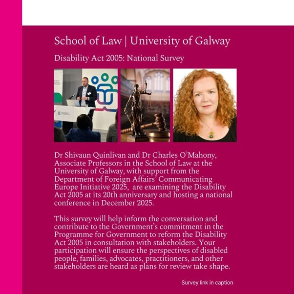 [Image description: A promotional poster from the School of Law, University of Galway, with a dark pink and maroon background. The heading reads: âSchool of Law | University of Galway. Disability Act 2005: National Survey.â Below are three images: one of a man speaking at a podium, one of the statue of Lady Justice, and one of a woman with curly red hair. Text underneath reads: âDr Shivaun Quinlivan and Dr Charles OâMahony, Associate Professors in the School of Law at the University of Galway, with support from the Department of Foreign Affairsâ Communicating Europe Initiative 2025, are examining the Disability Act 2005 at its 20th anniversary and hosting a national conference in December 2025. This survey will help inform the conversation and contribute to the Governmentâs commitment in the Programme for Government to reform the Disability Act 2005 in consultation with stakeholders. Your participation will ensure the perspectives of disabled people, families, advocates, practitioners, and other stakeholders are heard as plans for review take shape.â In small text at the bottom right corner: âSurvey link in caption.â]