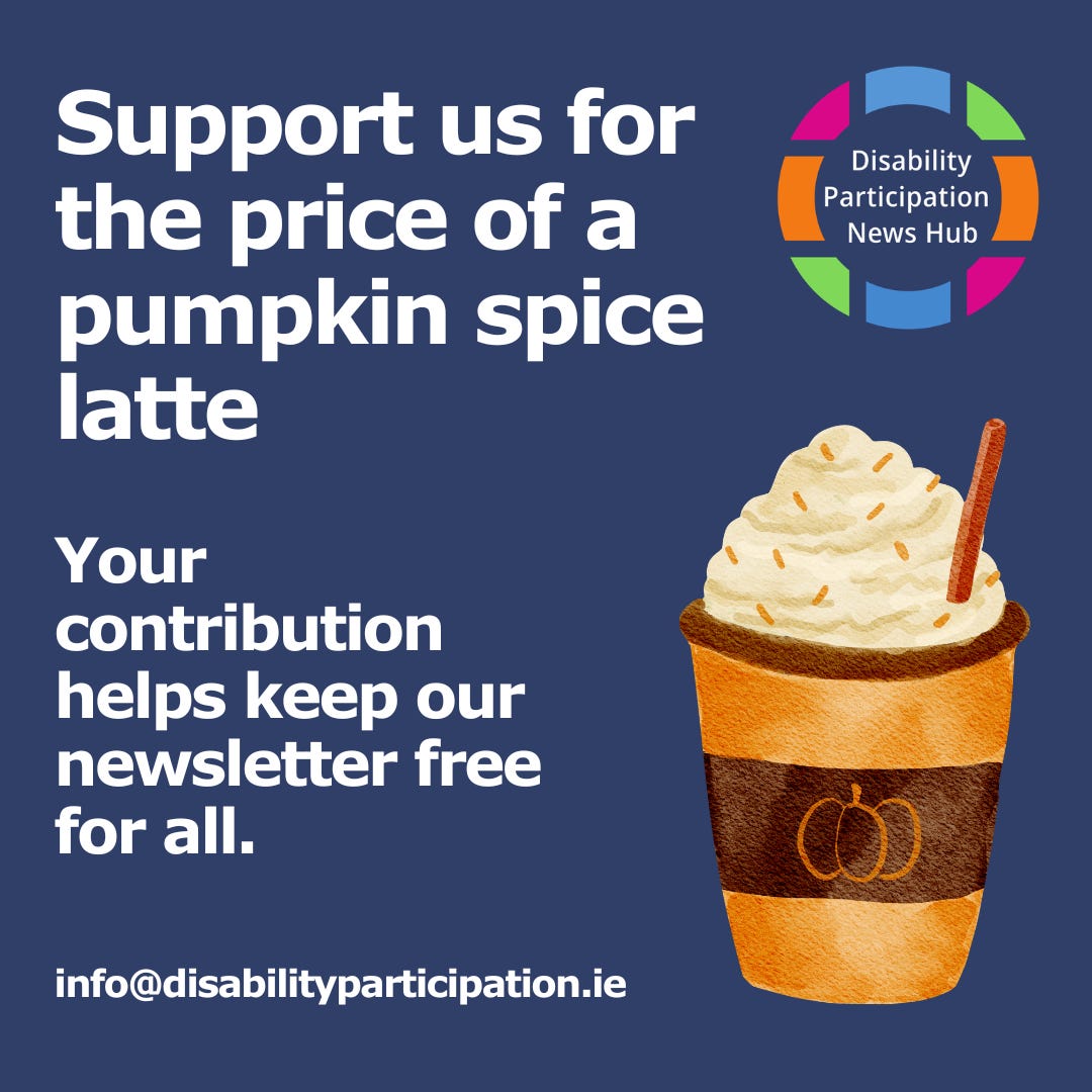 ![[Image description: A blue and pink background containing white text that reads: "Calls for Participation". Beneath this is an image of two speech bubbles. The Disability Participation News Hub is in the top right hand corner and the email address for the News Hub - info@disabilityparticipation.ie is at the bottom of the image.] [Image description: A blue and pink background containing white text that reads: "Calls for Participation". Beneath this is an image of two speech bubbles. The Disability Participation News Hub is in the top right hand corner and the email address for the News Hub - info@disabilityparticipation.ie is at the bottom of the image.]](https://substackcdn.com/image/fetch/$s_!Hm1r!,w_1456,c_limit,f_auto,q_auto:good,fl_progressive:steep/https%3A%2F%2Fsubstack-post-media.s3.amazonaws.com%2Fpublic%2Fimages%2Fc9d08bea-974f-459f-8424-6688c3391258_1080x1080.png)