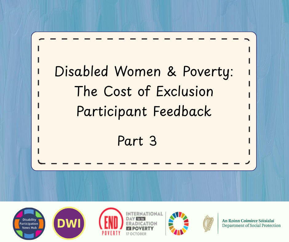 [Image description: A graphic with a light blue background featuring a brush stroke effect. A cream box is in the centre outlined by a dashed line with a hand-stitched effect. Inside the box, text reads: “Disabled Women & Poverty: The Cost of Exclusion Participant Feedback Part 3.” At the bottom are logos for the Disability Participation News Hub, Disabled Women Ireland (DWI), the International Day for the Eradication of Poverty, and the Department of Social Protection.]