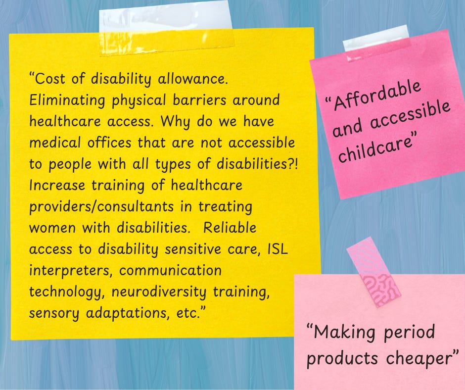[Image description: A graphic with a light blue background featuring a brush stroke effect. Three sticky notes contain participant feedback. A large yellow note reads: “Cost of disability allowance. Eliminating physical barriers around healthcare access. Why do we have medical offices that are not accessible to people with all types of disabilities?! Increase training of healthcare providers/consultants in treating women with disabilities. Reliable access to disability sensitive care, ISL interpreters, communication technology, neurodiversity training, sensory adaptations, etc.” A bright pink note reads: “Affordable and accessible childcare.” A light pink note reads: “Making period products cheaper.”]