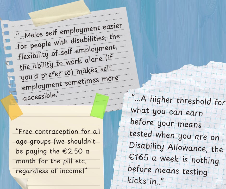 [Image description: A graphic with a light blue background featuring a brush stroke effect. Three notes display participant responses. A grey notepad-style page reads: “Make self-employment easier for people with disabilities, the flexibility of self-employment, the ability to work alone (if you’d prefer to) makes self-employment sometimes more accessible.” A cream notepad with yellow and green tape reads: “Free contraception for all age groups (we shouldn’t be paying the €2.50 a month for the pill etc. regardless of income).” A blue graph paper note reads: “A higher threshold for what you can earn before you’re means-tested when you are on Disability Allowance, the €165 a week is nothing before means testing kicks in.”]
