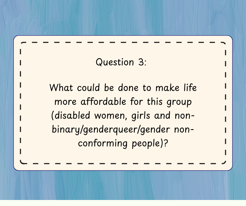 [Image description: A graphic with a light blue background featuring a brush stroke effect. A cream box is in the centre outlined by a dashed line with a hand-stitched effect. Inside the box, text reads: “Question 3: What could be done to make life more affordable for this group (disabled women, girls and non-binary/genderqueer/gender non-conforming people)?”]