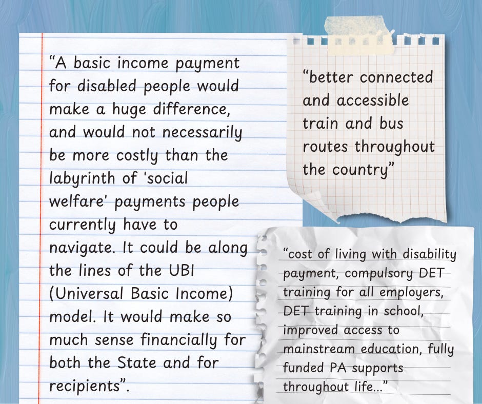 [Image description: A graphic with a light blue background featuring a brush stroke effect. Three notepaper-style shapes show participant responses. A large white lined note on the left reads: “A basic income payment for disabled people would make a huge difference, and would not necessarily be more costly than the labyrinth of ‘social welfare’ payments people currently have to navigate. It could be along the lines of the UBI (Universal Basic Income) model. It would make so much sense financially for both the State and for recipients.” A beige torn note on the right reads: “Better connected and accessible train and bus routes throughout the country.” A smaller white note at the bottom reads: “Cost of living with disability payment, compulsory DET training for all employers, DET training in school, improved access to mainstream education, fully funded PA supports throughout life.”]