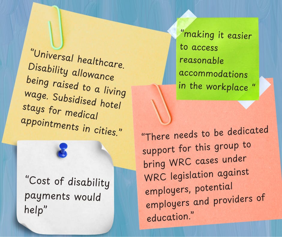 [Image description: A graphic with a light blue background featuring a brush stroke effect. Four colourful paper notes display participant feedback. A large yellow note with a green paperclip reads: “Universal healthcare. Disability allowance being raised to a living wage. Subsidised hotel stays for medical appointments in cities.” A green note reads: “Making it easier to access reasonable accommodations in the workplace.” A red-orange note reads: “There needs to be dedicated support for this group to bring WRC cases under WRC legislation against employers, potential employers and providers of education.” A white pinned note reads: “Cost of disability payments would help.”]