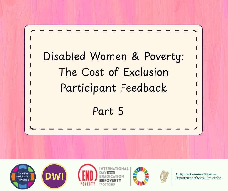 [Image 1 description: A graphic with a pink brush-stroke background. In the centre is a cream box with a black hand-stitched border. Text reads: “Disabled Women & Poverty: The Cost of Exclusion – Participant Feedback – Part 5.” Along the bottom are logos for Disability Participation News Hub, Disabled Women Ireland and the Department of Social Protection.]