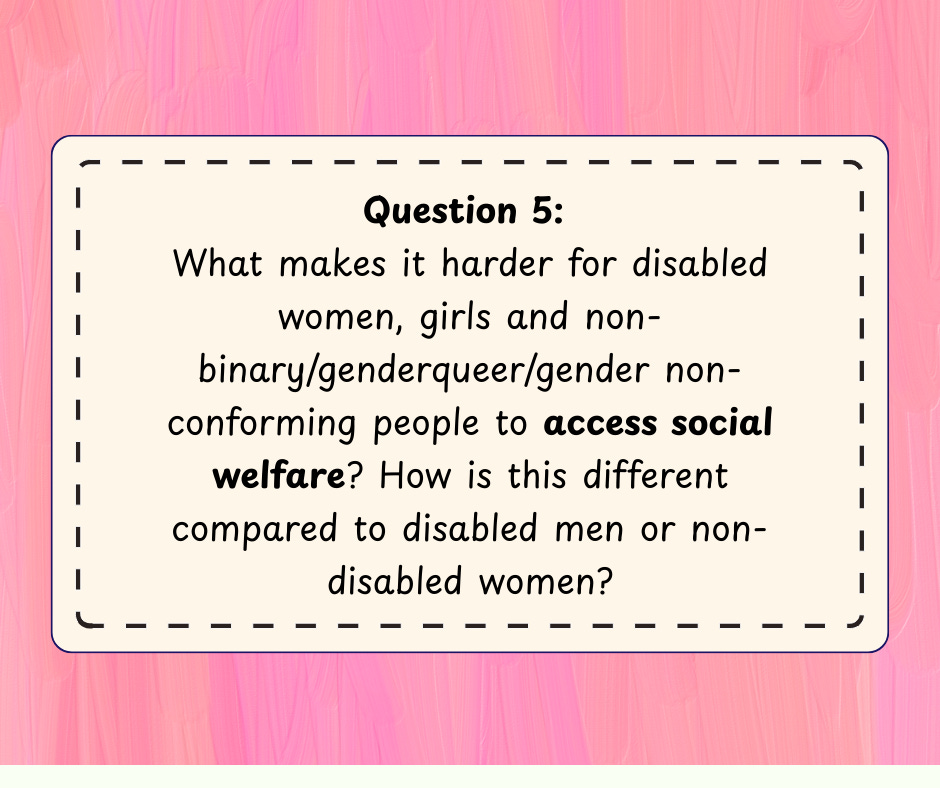 “What makes it harder for disabled women, girls and non-binary/genderqueer/gender non-conforming people to access social welfare? How is this different compared to disabled men or non-disabled women?