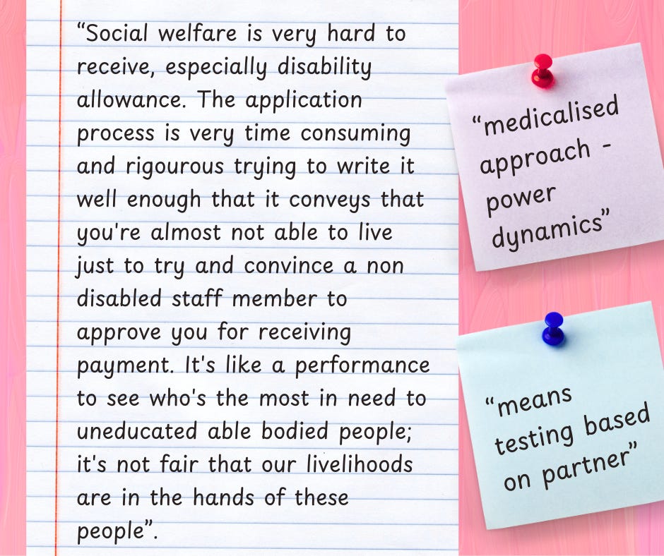 [Image 4 description: A collage-style graphic with a lined notebook page and pastel sticky notes. On lined paper: “Social welfare is very hard to receive, especially disability allowance. The application process is very time consuming and rigourous trying to write it well enough that it conveys that you’re almost not able to live just to try and convince a non disabled staff member to approve you for receiving payment. It’s like a performance to see who’s the most in need to uneducated able bodied people; it’s not fair that our livelihoods are in the hands of these people.”
