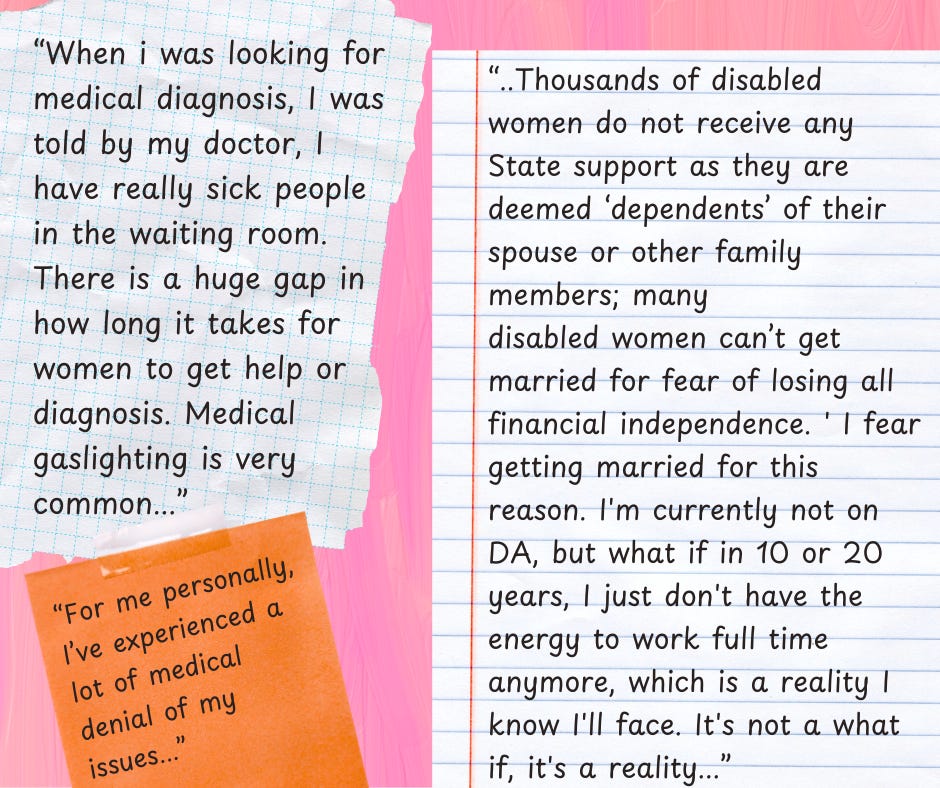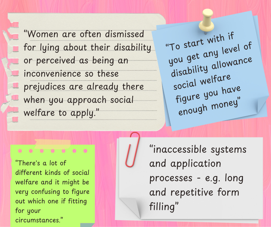 [Image 3 description: A collage-style graphic over a pink brush-stroke background with several paper notes and sticky notes. On lined torn notebook paper: “Women are often dismissed for lying about their disability or perceived as being an inconvenience so these prejudices are already there when you approach social welfare to apply.”