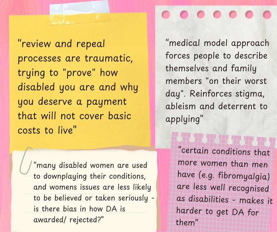 “certain conditions that more women than men have (e.g. fibromyalgia) are less well recognised as disabilities – makes it harder to get DA for them.”