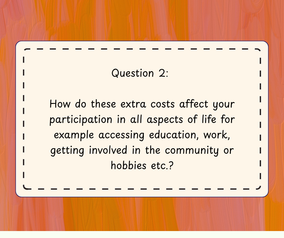 [Image description: A graphic with an orange and pink background with a brush stroke effect. A cream box is in the centre outlined by a dashed line with a hand-stitched effect. Inside the box, text reads: “Question 2: How do these extra costs affect your participation in all aspects of life for example accessing education, work, getting involved in the community or hobbies etc.?”]