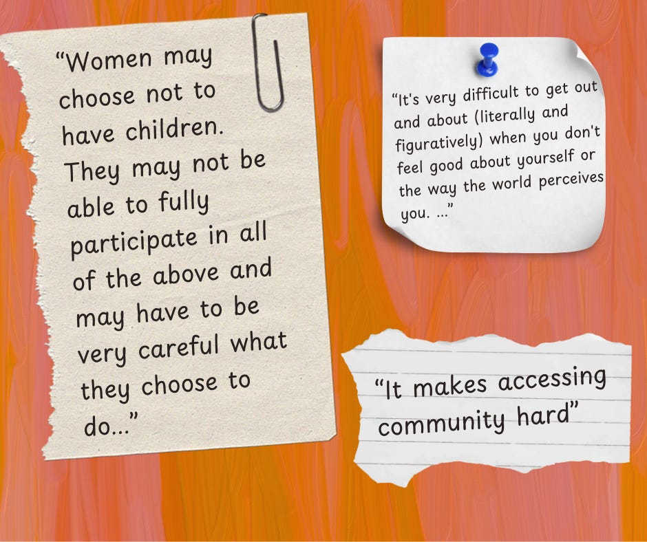 [Image description: A graphic with an orange and pink background with a brush stroke effect. Three paper notes contain participant quotes. A large beige torn note with a paperclip reads: “Women may choose not to have children. They may not be able to fully participate in all of the above and may have to be very careful what they choose to do…” A white pinned note reads: “It’s very difficult to get out and about (literally and figuratively) when you don’t feel good about yourself or the way the world perceives you…” A smaller torn strip at the bottom reads: “It makes accessing community hard.”]