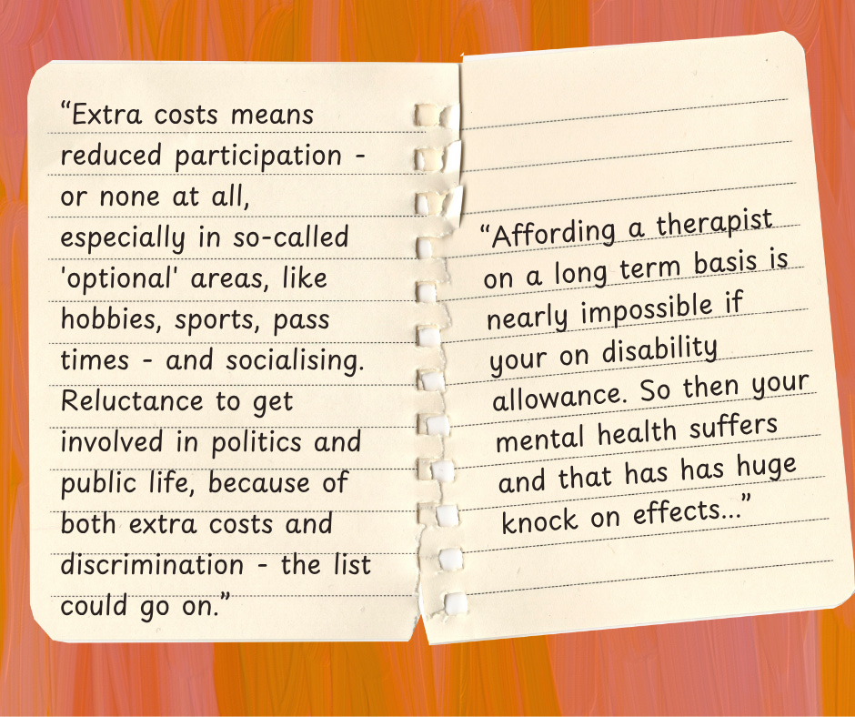 [Image description: A graphic with an orange and pink background with a brush stroke effect. The image shows an open notebook with two pages of participant quotes. The left page reads: “Extra costs means reduced participation – or none at all, especially in so-called ‘optional’ areas, like hobbies, sports, pass times – and socialising. Reluctance to get involved in politics and public life, because of both extra costs and discrimination – the list could go on.” The right page reads: “Affording a therapist on a long term basis is nearly impossible if you’re on disability allowance. So then your mental health suffers and that has huge knock-on effects…”]
