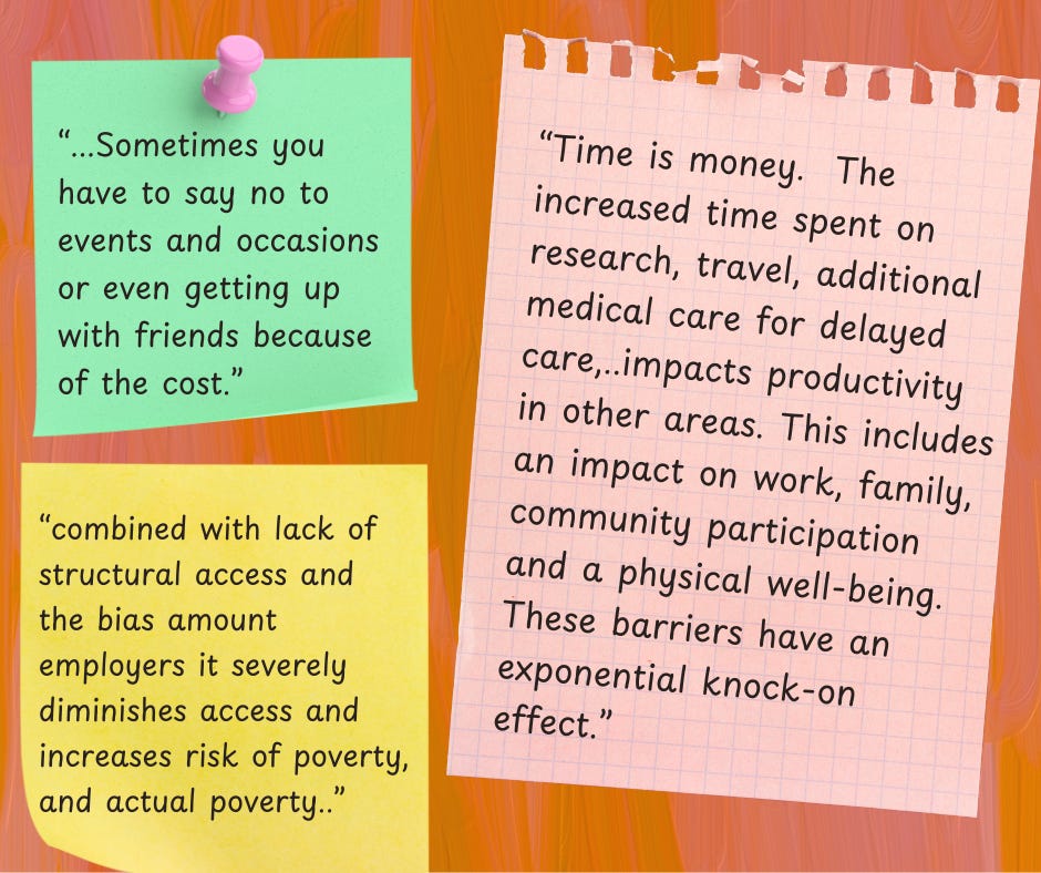 [Image description: A graphic with an orange and pink background with a brush stroke effect. Three colourful notes display participant feedback. A mint green note with a pink pin reads: “...Sometimes you have to say no to events and occasions or even getting up with friends because of the cost.” A yellow note reads: “Combined with lack of structural access and the bias among employers it severely diminishes access and increases risk of poverty, and actual poverty.” A pink notepad-style sheet reads: “Time is money. The increased time spent on research, travel, additional medical care for delayed care, impacts productivity in other areas. This includes an impact on work, family, community participation and physical well-being. These barriers have an exponential knock-on effect.”]