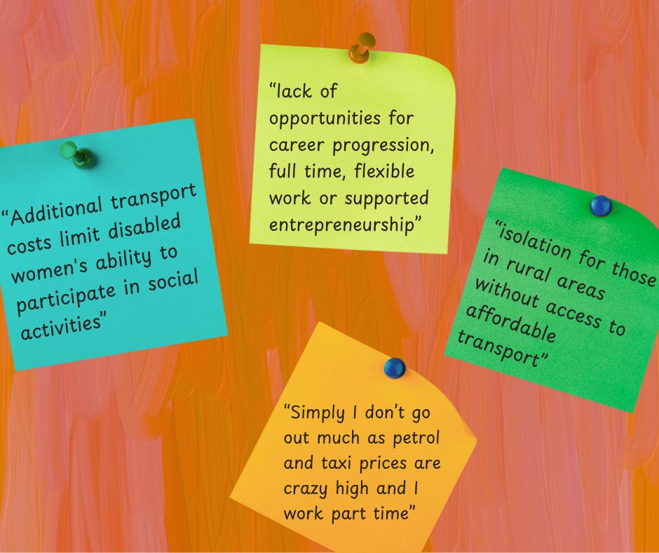 [Image description: A graphic with an orange and pink background with a brush stroke effect. Four colourful sticky notes contain participant quotes. A blue note reads: “Additional transport costs limit disabled women’s ability to participate in social activities.” A lime green note reads: “Lack of opportunities for career progression, full time, flexible work or supported entrepreneurship.” A dark green note reads: “Isolation for those in rural areas without access to affordable transport.” An orange note reads: “Simply I don’t go out much as petrol and taxi prices are crazy high and I work part time.”]
