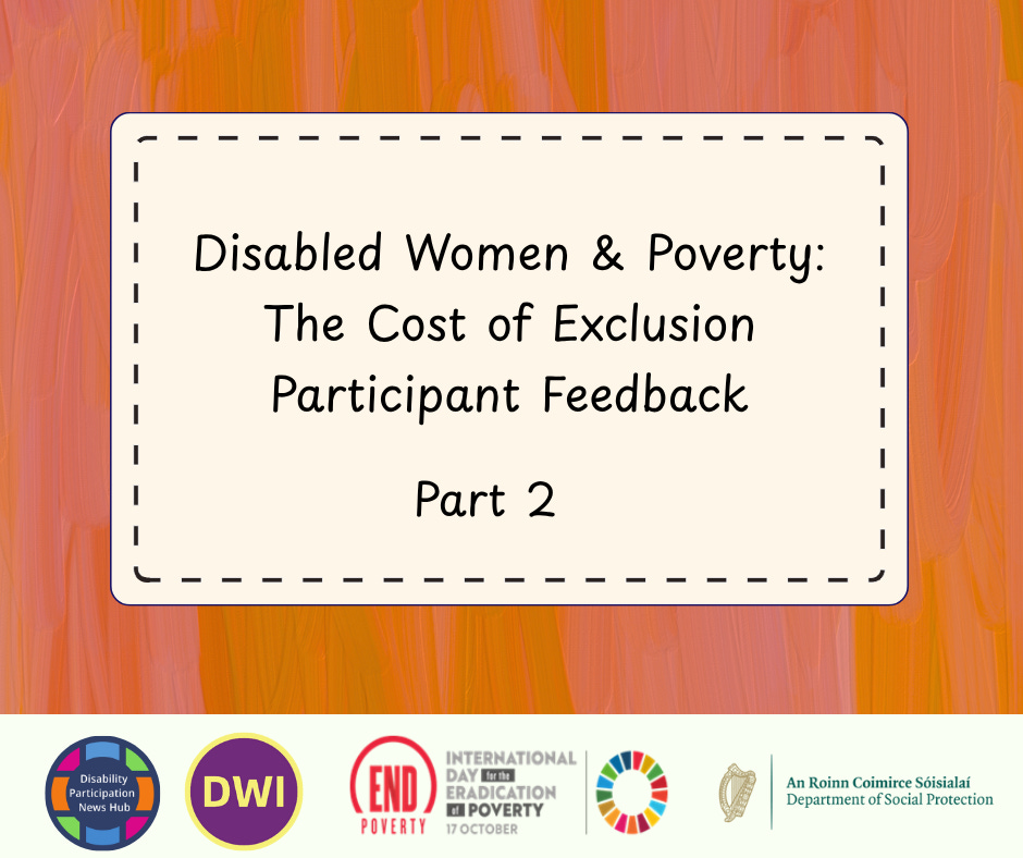 [Image description: A graphic with an orange and pink background with a brush stroke effect. A cream box is in the centre outlined by a dashed line with a hand-stitched effect. Inside the box, text reads: “Disabled Women & Poverty: The Cost of Exclusion Participant Feedback Part 2.” At the bottom are logos for the Disability Participation News Hub, Disabled Women Ireland (DWI), the International Day for the Eradication of Poverty, and the Department of Social Protection.]