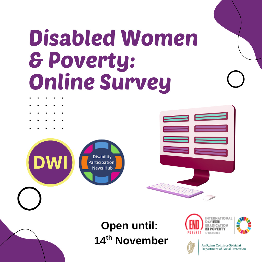 [Image Description: Graphic promoting an online survey titled “Disabled Women & Poverty: Online Survey.” The design includes purple and pink accents, with an illustration of a computer screen and keyboard. Logos at the bottom represent DWI, Disability Participation News Hub, the Department of Social Protection, and the International Day for the Eradication of Poverty. Text indicates the survey is open until 14th November.]