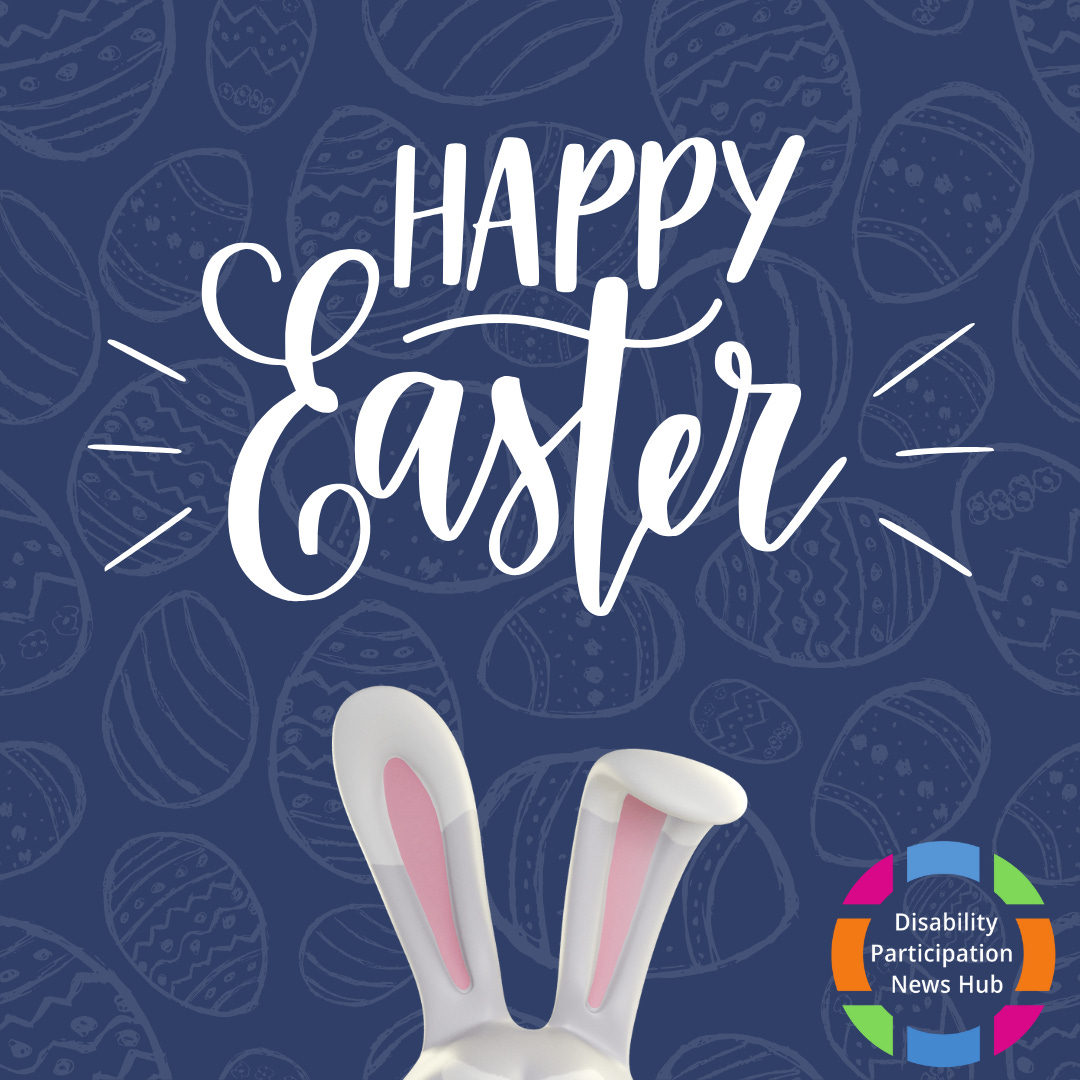 [Image: A blue graphic decorated with outlines of Easter eggs. Two white rabbit ears pop up from the bottom of the image and white text reads: “Happy Easter”. The logo for the Disability Participation News Hub is in the bottom right hand corner.]