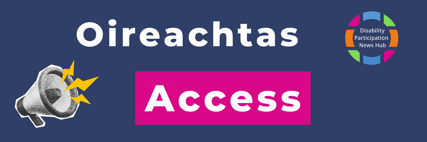 [Image Description: A graphic with a dark blue background depicting a black and white megaphone and the Disability Participation News Hub Logo in the top right hand corner. In the centre of the image, large white text on a pink banner reads: “Oireachtas Access”.]